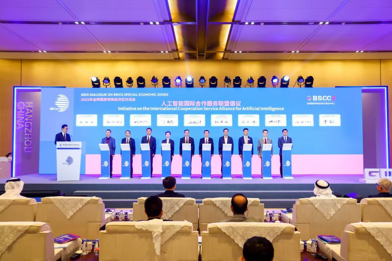 当前,人工智能作为新一轮科技革命和产业变革的核心驱动力,正深刻重塑全球经济格局和产业发展。对话会上,发起了人工智能产业合作与发展杭州倡议以及人工智能国际合作服务联盟倡议,发布了《金砖国家特殊经济区经贸合作发展报告(2025)——合作动向、中国实践与未来路径》。