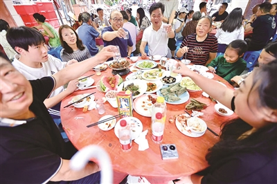 傍晚时分,骆家庄西苑一区的主干道上,450张餐桌摆出蜿蜒长龙,坐等新老杭州人入席。