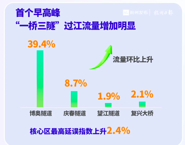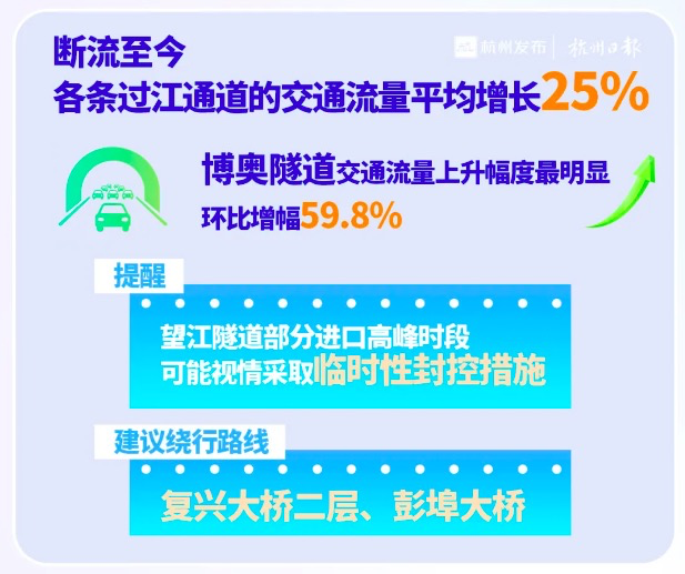 目前仍处于断流初期,交通流尚未完全稳定,明天(12月1日)周一早高峰跨江交通压力仍然较大,杭州交警再次倡议市民绿色出行。
