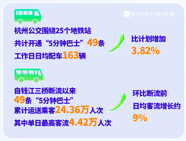 同时,杭州公交推出49条“5分钟接驳巴士”。从过去一周来看,这批巴士单日最高客流4.42万人次,环比断流前日均客流增长约9%。