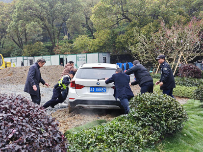 临近清明祭扫高峰期,留下街道石马社区工作者持续值守在杭州市第二公墓入口区域。3月30日上午,一场春雨让公墓入口的土路变得泥泞湿滑。一辆私家车因操作不当,右前轮深陷泥坑无法脱困。正在执勤的工作人员发现后,立即招呼三名同事上前帮忙。四人俯身抵住车尾,喊着号子连推三次,终于将车辆推出泥潭。“多亏你们搭把手!有你们在真是让人安心!”车主连声道谢后,工作人员又细心提醒他下山时注意缓行。