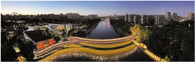 昨晚,拱墅区小河公园跨运河人行桥点亮照明及景观装饰灯,宛若在京杭大运河上架起一座繁星簇拥的“鹊桥”。今天恰逢“七夕”佳节,这座独特的“Y”形弧线造型天桥正式开通,为市民游客增添了一条连接运河两岸多元文化活动场景的舒适步行通道。