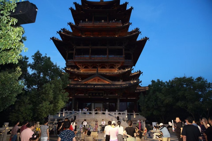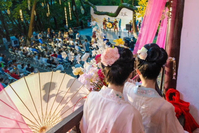 当 “爱在七夕 情定望宸” 活动的序幕待启,吴山艺术团以一场沉浸式实景演绎,将千年前宋时市井的热闹与雅致,悄然晕染在半山的夏夜之间 。“哐 — 哐 —”锣声响起,只见皇城司四人抬锣、统领敲锣,伴随演员扬声吆喝 “开市喽,今日无税!”那喊声清亮如檐角风铃,瞬间唤醒了古市集的鲜活气息,让人恍若站在临安街头。随后一场灵动优美的开市舞蹈压轴登场,舞姿翩跹间,拉开了“爱在七夕 情定望宸”活动的浪漫序幕。