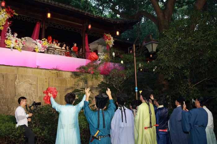 值得一提的是,本次活动全程贯穿 “一路好运 梦回临安” 的古风主题——所有嘉宾及来宾身着华服入场,市集摊位、活动环节均以宋韵风格布置展陈,实景还原古代七夕场景。市民游客可沉浸式参与 cosplay,无论是身着汉服漫步市集,还是在仪式现场拍照留念,每一张照片、每一帧视频都宛如影视大片,让人仿佛“穿越”回临安盛世,感受传统节日的现代演绎。