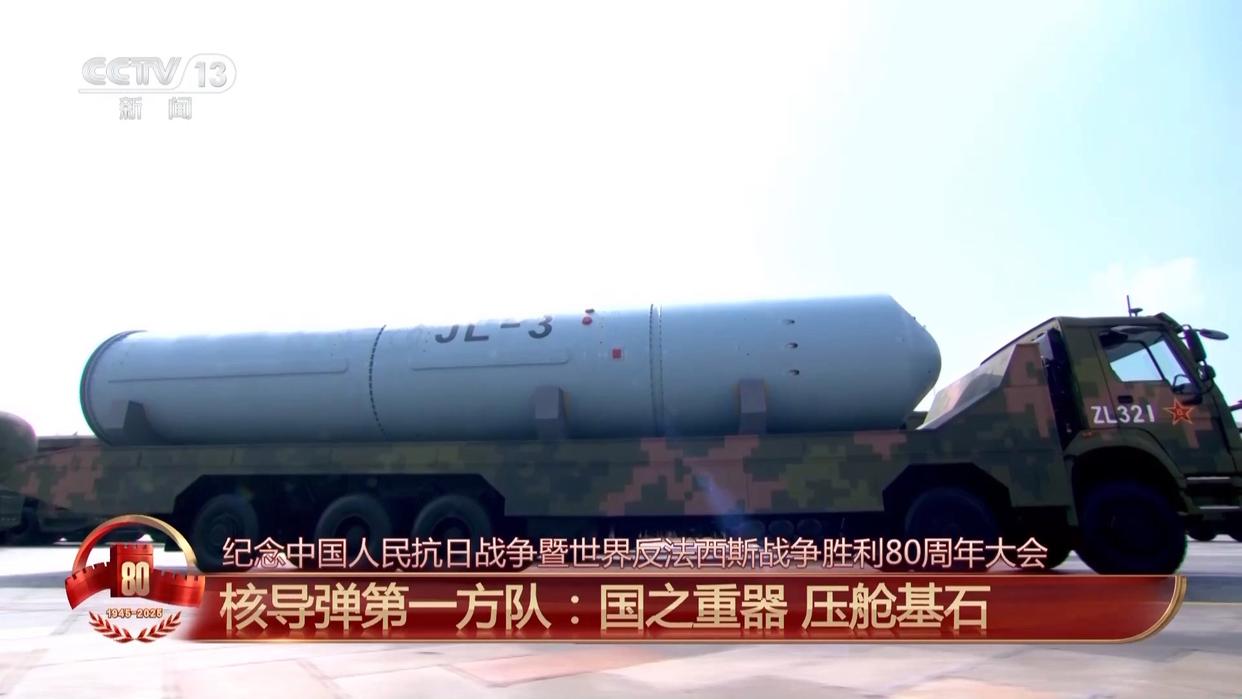 震撼登场的核导弹第一方队,受阅装备依次为 “惊雷-1”空基远程导弹、“巨浪-3”潜射洲际导弹、“东风-61”陆基洲际导弹和“东风-31”新型陆基洲际导弹,是维护国家主权、捍卫民族尊严的战略“王牌”。