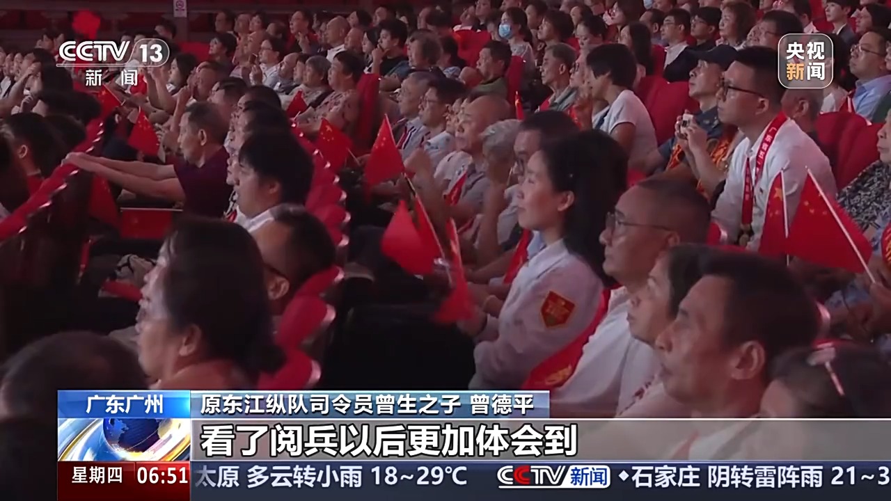 原东江纵队司令员曾生之子 曾德平:我今年80岁了,抗日战争胜利的时候我出生了。父辈拿的是什么武器,哪里谈得上现在的这种装备,但是我们硬是胜利了。我们靠的就是中华民族的精神,靠的是我们民族的底蕴。国家有难,匹夫有责,这一句话流传在我们心里。看了阅兵以后,更加体会到我们中华民族的这种精神的伟大。