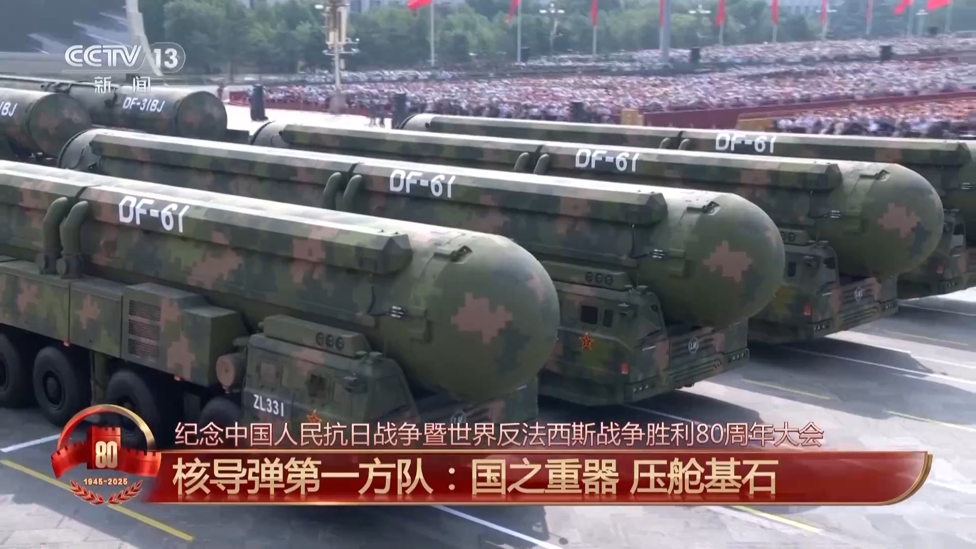 震撼登场的核导弹第一方队,受阅装备依次为 “惊雷-1”空基远程导弹、“巨浪-3”潜射洲际导弹、“东风-61”陆基洲际导弹和“东风-31”新型陆基洲际导弹,是维护国家主权、捍卫民族尊严的战略“王牌”。