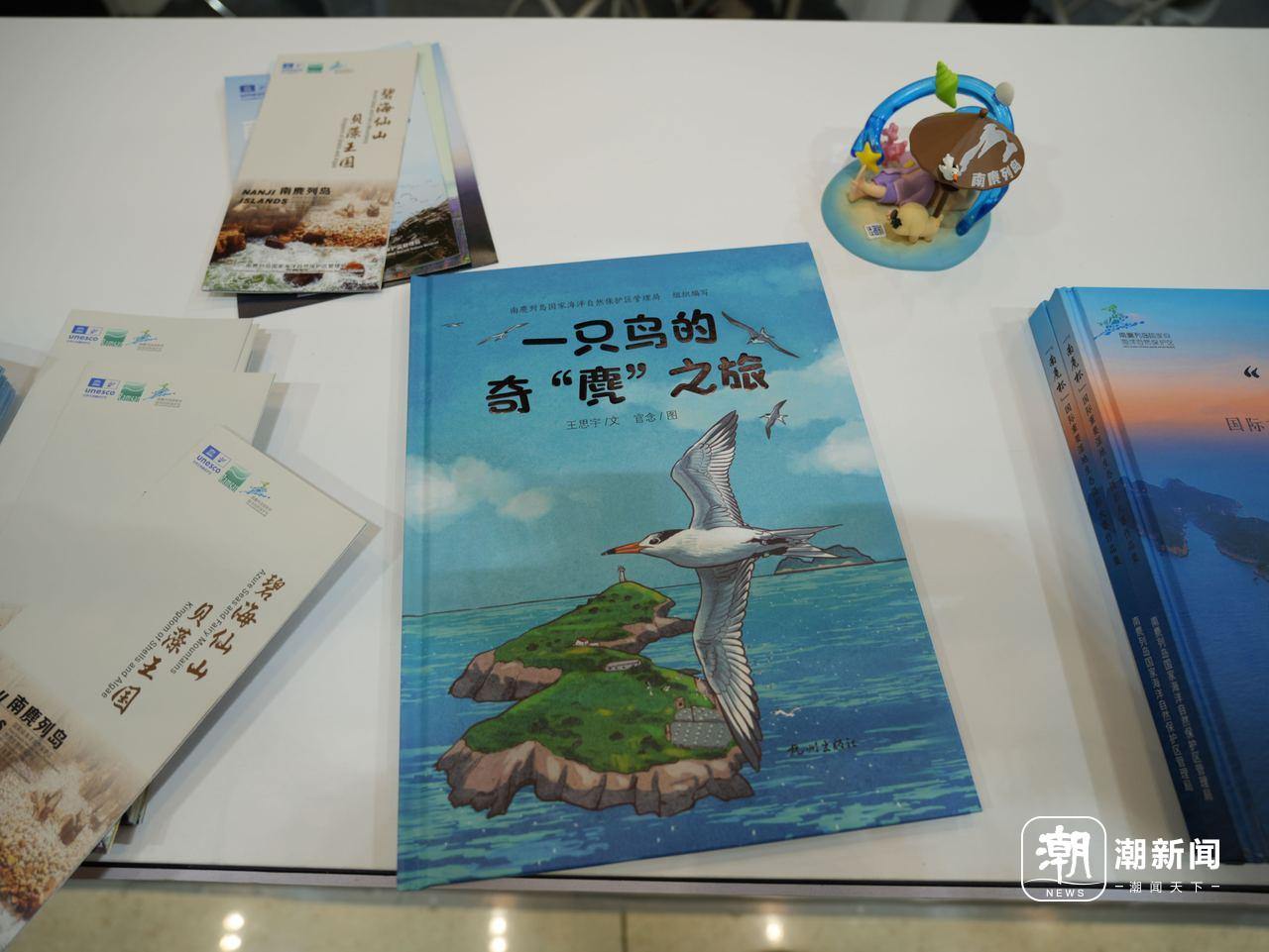 展台前,不少过往的代表嘉宾、工作人员被一本手绘绘本《一只鸟的奇“麂”之旅》吸引。