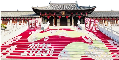 南宋德寿宫遗址博物馆处处洋溢喜庆的氛围。红墙上的“杭州”二字,以经典蛇纹“蟠虺纹”作为画面底纹,成为亮眼的文化打卡新地标;红墙之外,“巳巳如意‘贪食蛇’”秋叶艺术装置独具匠心,金黄的秋叶巧妙组合,营造出浓郁的新春氛围。