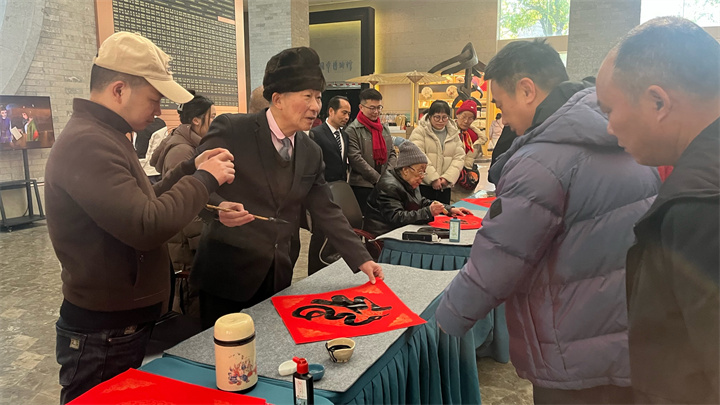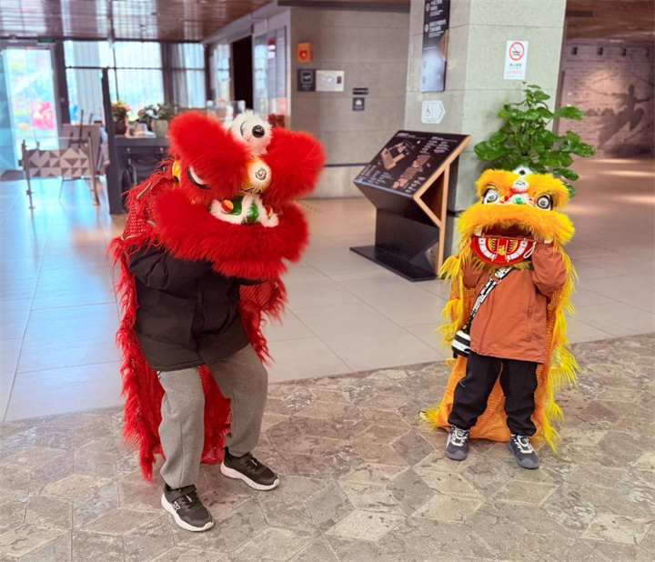 馆区内,游客与市民现场书写福字、春联。舞狮体验活动也在大厅同步开启,不少小游客排队穿上舞狮服饰,在鼓点声中体验舞狮的魅力。