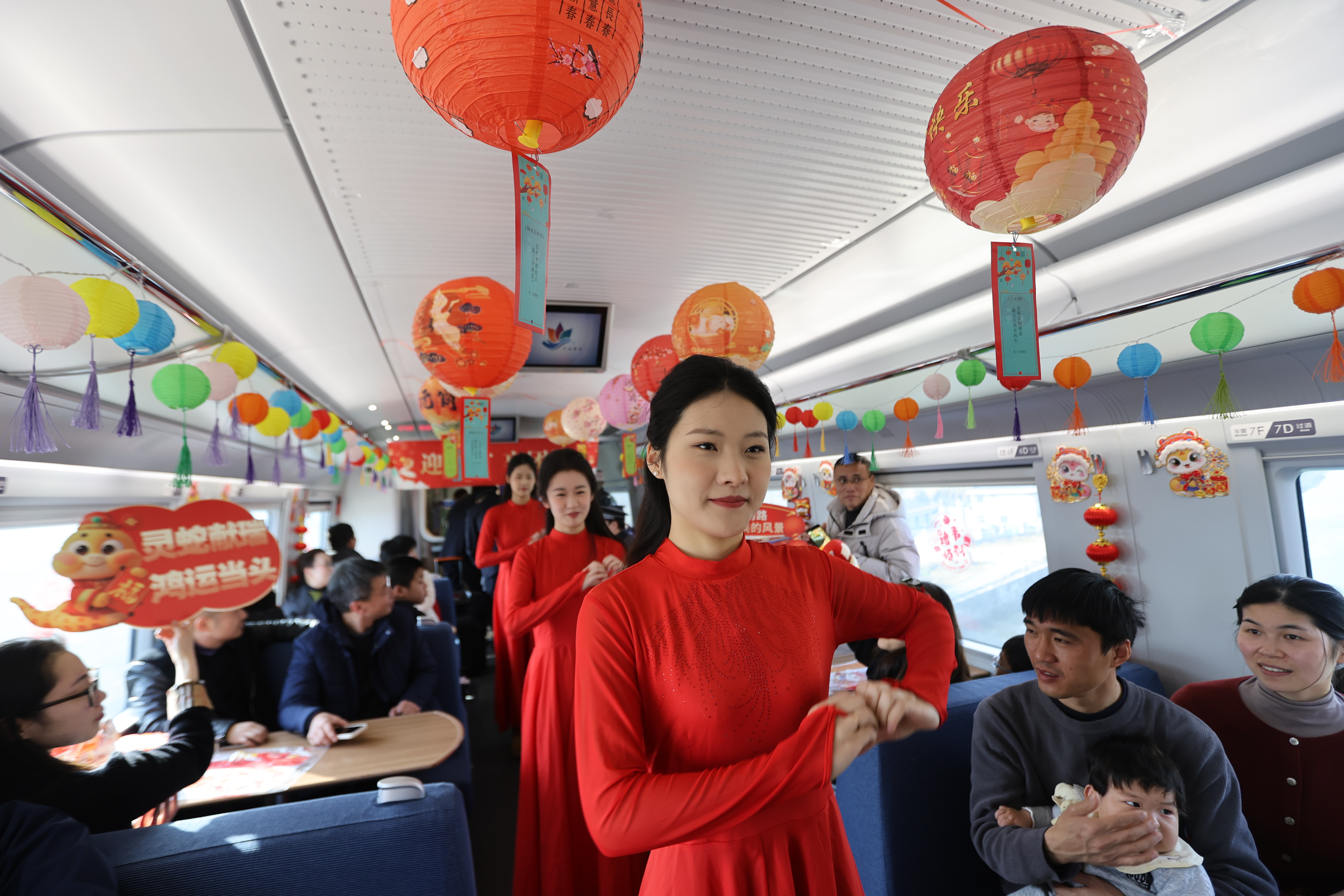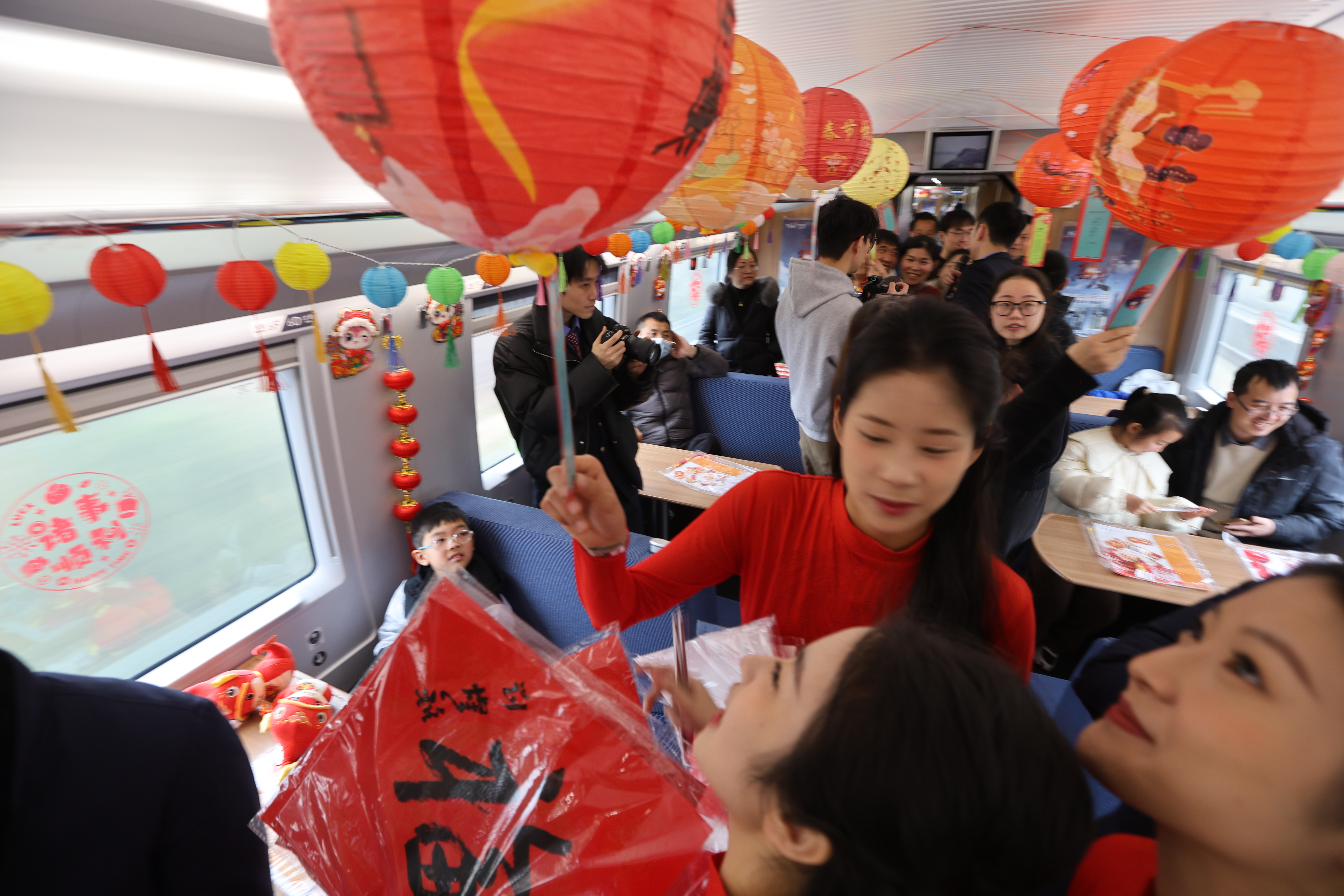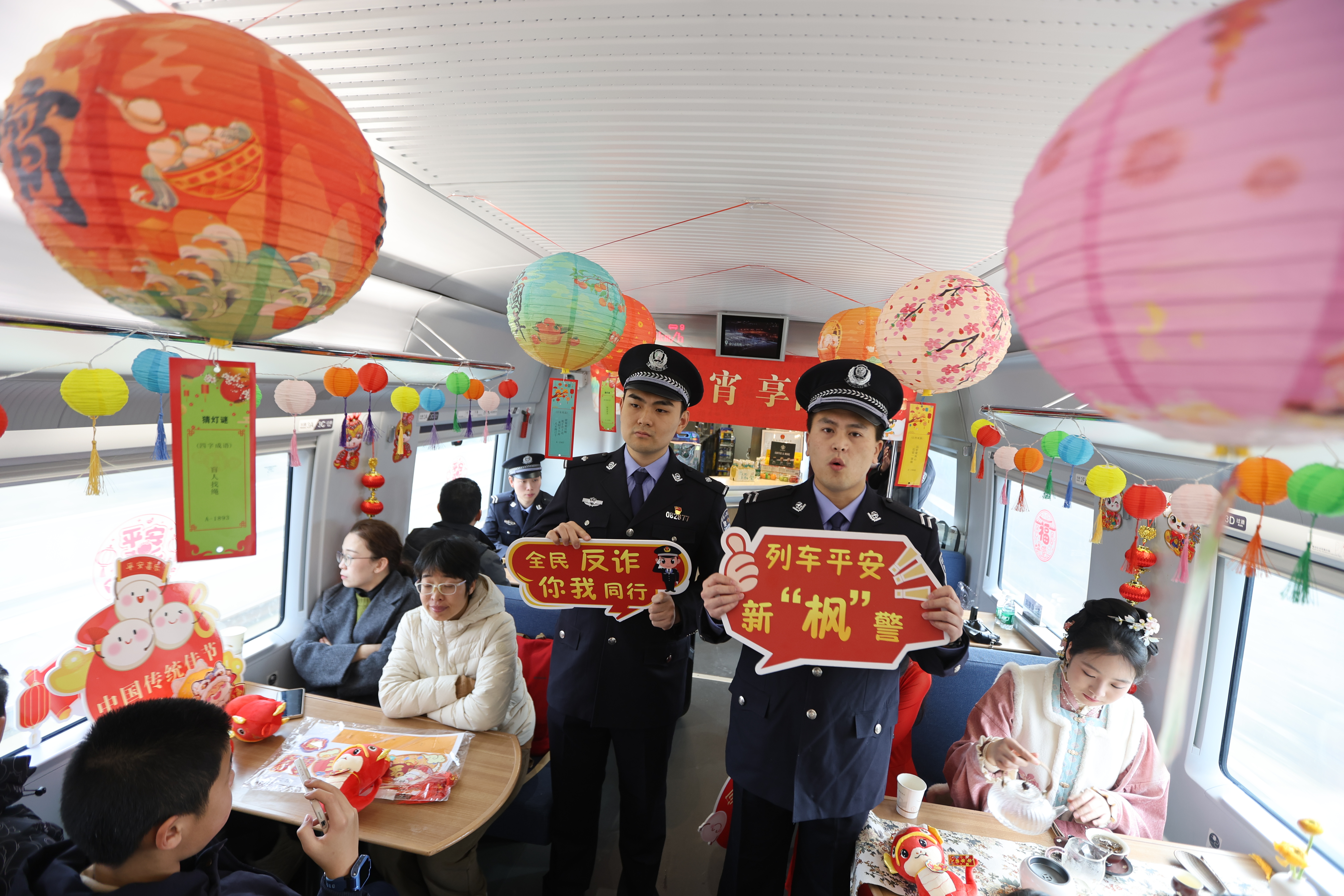 2月10日上午,由杭州客运段高铁五车队联合杭州乘警支队乘务五大队共同举办的“迎元宵 享团圆”主题活动,在G7428次从杭州西开往芜湖的列车9号餐车上欢乐上演。活动现场,20多个古风灯谜灯笼、4条3米灯笼串、数十个手折灯笼,为车厢营造出浓厚的节日氛围 。