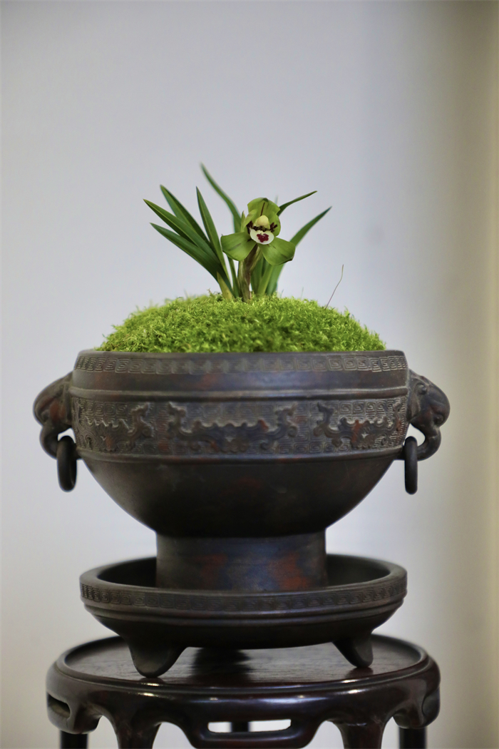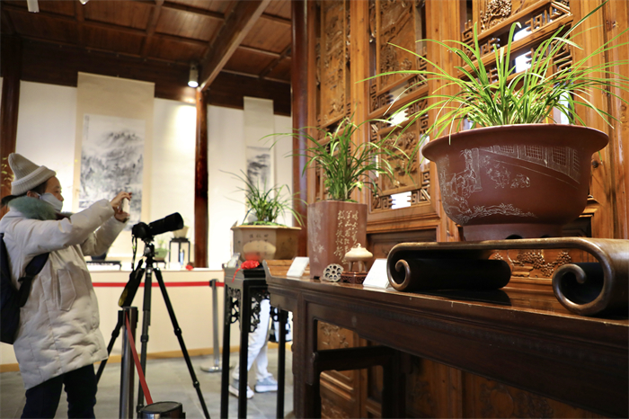 赏兰不光看花,花盆也大有来头。古人品鉴和布置兰花盆栽时,注重自然与意境的结合,且多用紫砂盆或陶瓷盆,盆形简洁,颜色素雅,以衬托兰花的高洁,再搭配奇石、竹器等,增添自然气息,本次兰花展就完美展现了珍品兰花与精致古盆相映生辉的场景。