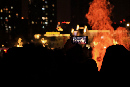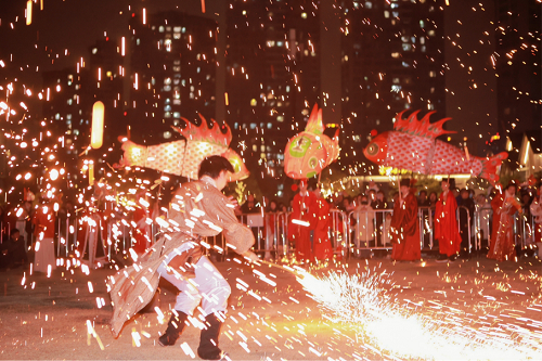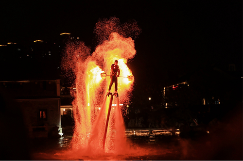 当夜色降临,华灯初上,鱼灯巡游队伍如同夜空中的璀璨星辰,缓缓点亮老街的每一个角落;游客们在河中放入一盏盏花灯,表达对新年的美好期许与祝愿;闲林桦树流星、余杭五谷龙、鸬鸟鳌鱼灯、仁和高头竹马等余杭镇街非遗项目接连登场……随着水面上跃起一抹火光,最令观众期待的“水上火壶”表演将现场气氛推向高潮。表演者在空中旋转,火壶撒出的火花与飞行器喷射出的水花在夜空中交织飞舞,宛若“火树银花”。