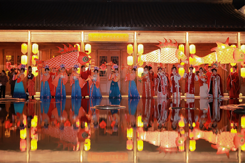 活动现场,元宵灯笼高挂,许愿河灯长明,还有大型鱼灯穿梭在人群中!说书、水袖舞、皮影戏、火戏等表演轮番上阵,投壶、对弈、猜灯谜、对诗词、放河灯等游戏欢乐不停,还有非遗印糕、糖葫芦、元宵等特色美食直击味蕾。