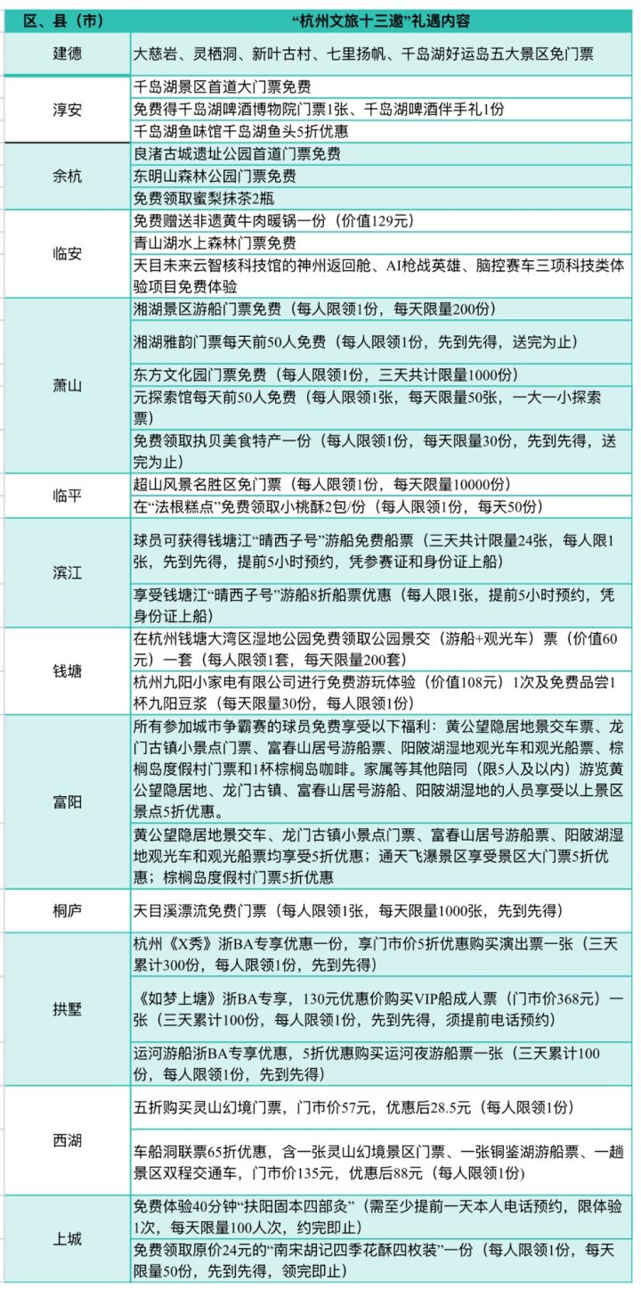 简单来说,杭州文旅将为来杭州参加比赛的客队所在地市或者区、县(市)居民以及所有来杭参加比赛的球队队员提供荣耀礼遇。