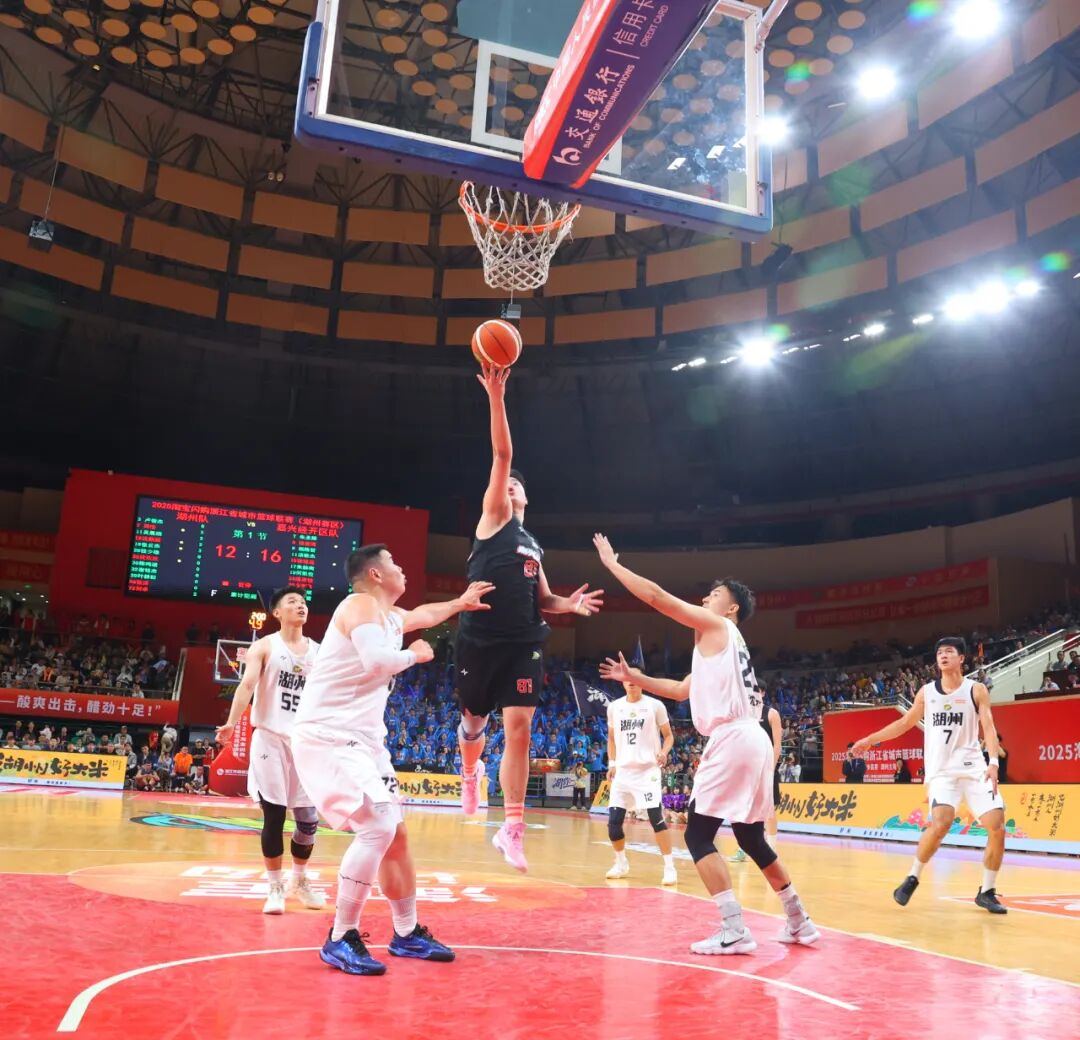 易边再战,比赛彻底进入白热化。关键的第三节,双方在外线展开对攻,接连命中三分,下起一阵“三分雨”,比分始终紧咬,难分高下。战局胶着之际,在潘承恺被对手重点盯防后,老将张磊挺身而出,凭借一记关键三分一度为球队夺回先机。然而湖州队攻势不减,通过激烈的篮下拼抢与严密的外线防守,再度取得微弱领先。面对压力,潘承恺强行突破内线攻下两分,并稳健命中两次罚球,顽强将比分追平。但本节末段,湖州队打出一波进攻小高潮,将分差拉开至13分。