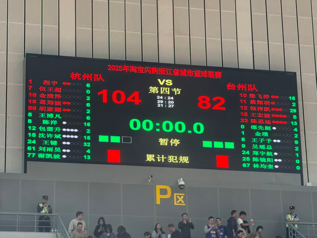 末节决战,杭州队再次将防守强度拉满,半节时间只让台州队得到了5分,顺势打出一波13-5将分差扩大到了11分。然而,暂停后的台州队依然没能止住颓势,反而是杭州队在两分钟轰出一波10-0,彻底锁定胜局。最终,杭州队以104-82大胜对手。