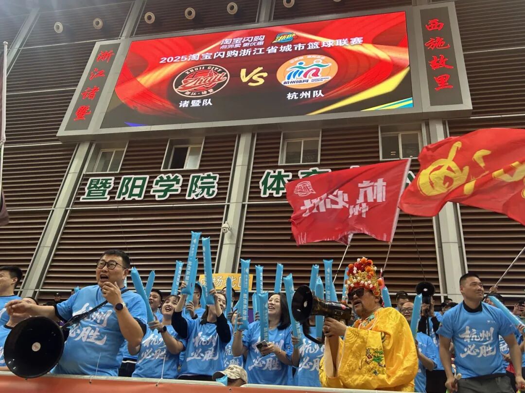 两支队伍的啦啦队早早便抵达了球场,激昂的鼓声如雷贯耳,响彻整个场馆。身穿蓝色队服的杭州队啦啦队与身着红色战袍的诸暨队拉拉队分庭抗礼,你来我往之间,呐喊声、助威声此起彼伏,瞬间点燃了全场的热情,将气氛推向高潮。
