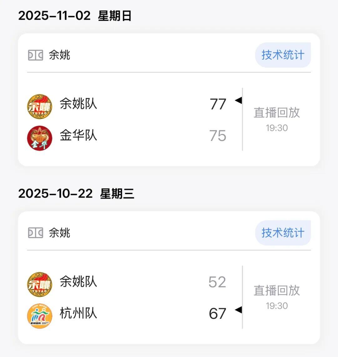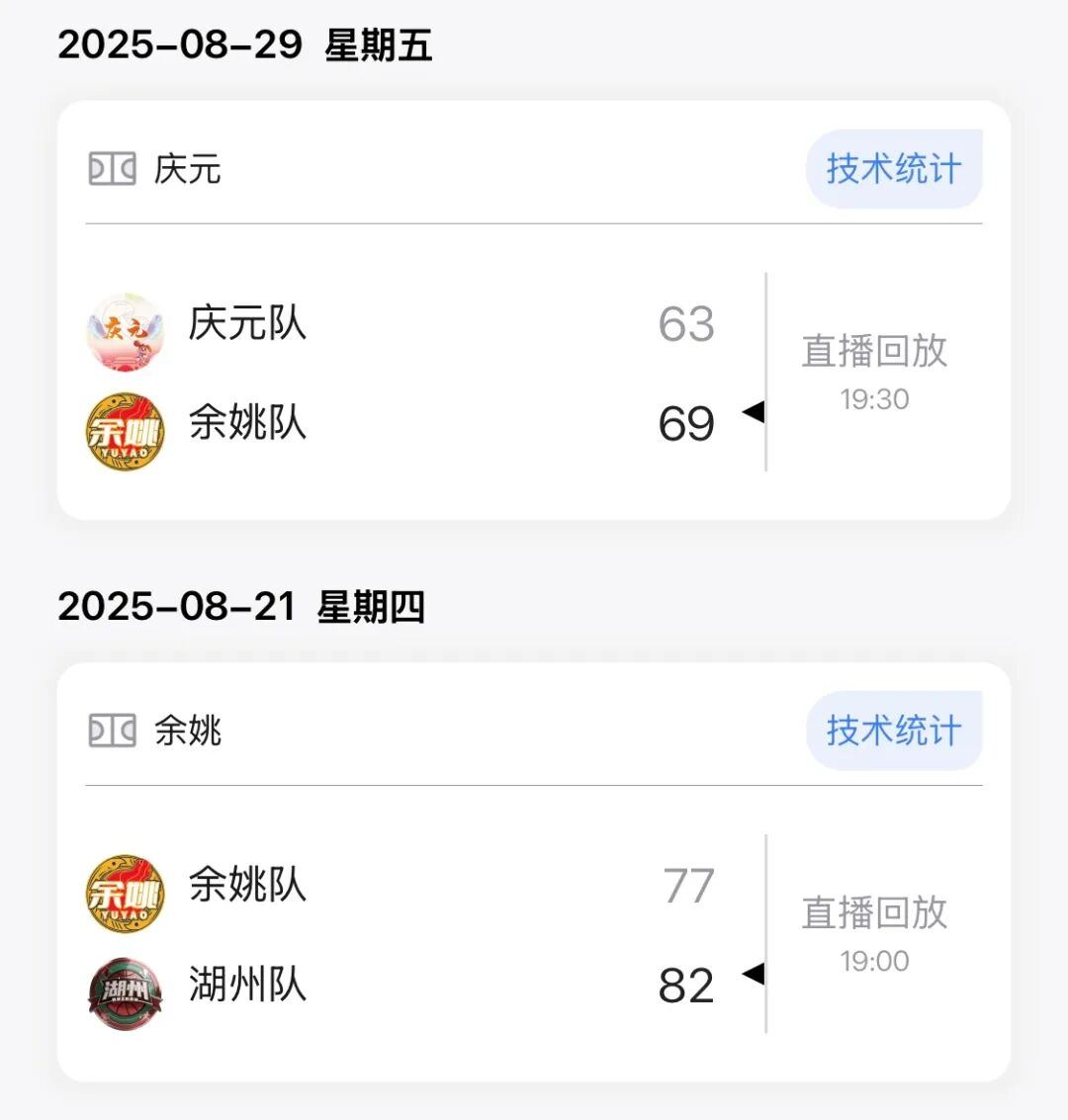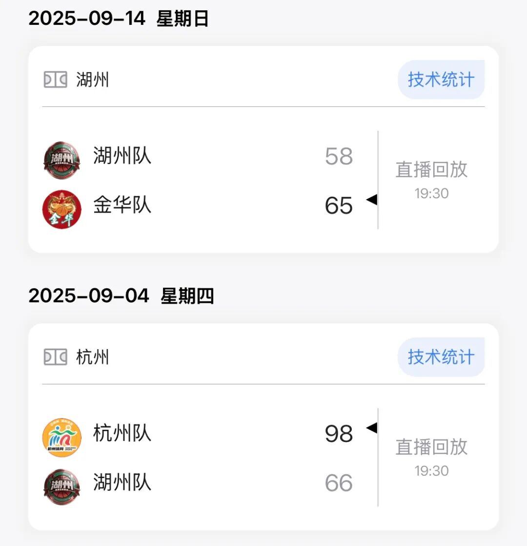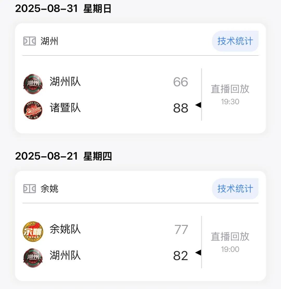 湖州队下一场比赛将在11月16日19:30客场对阵诸暨队,余姚队下一场比赛将在11月15日19:30主场对阵庆元队。