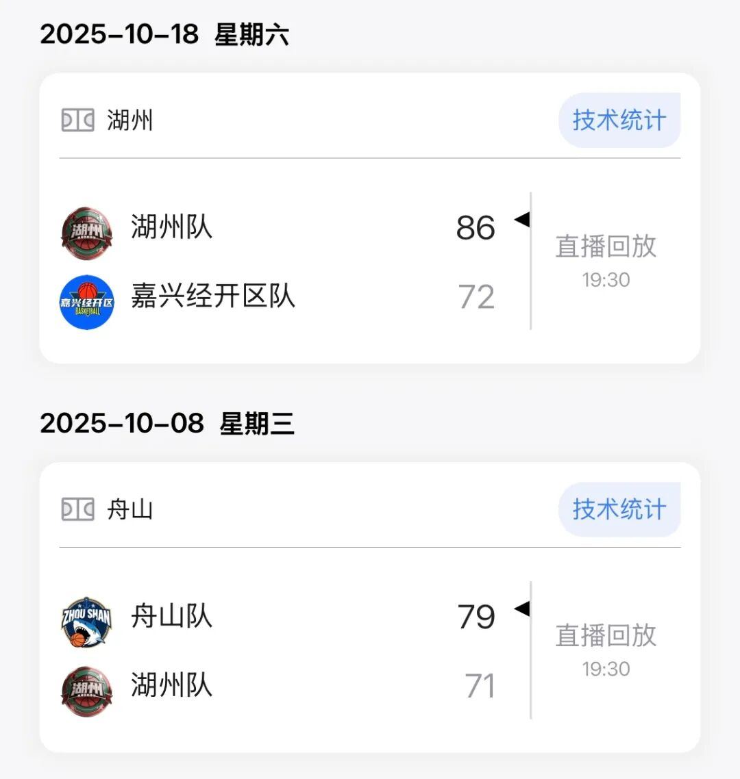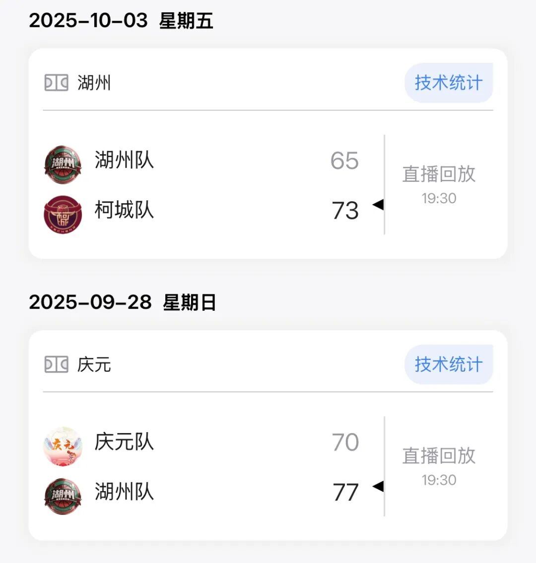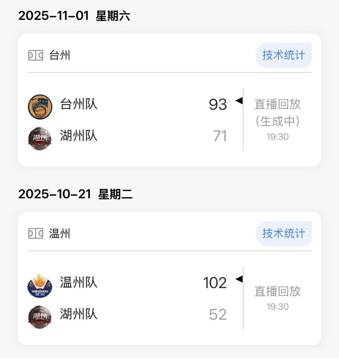湖州队下一场比赛将在11月16日19:30客场对阵诸暨队,余姚队下一场比赛将在11月15日19:30主场对阵庆元队。