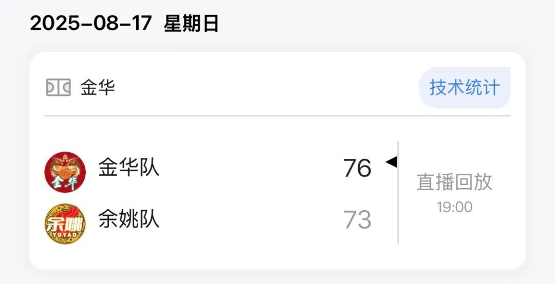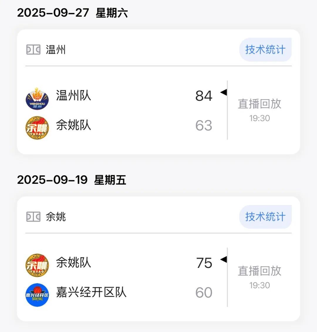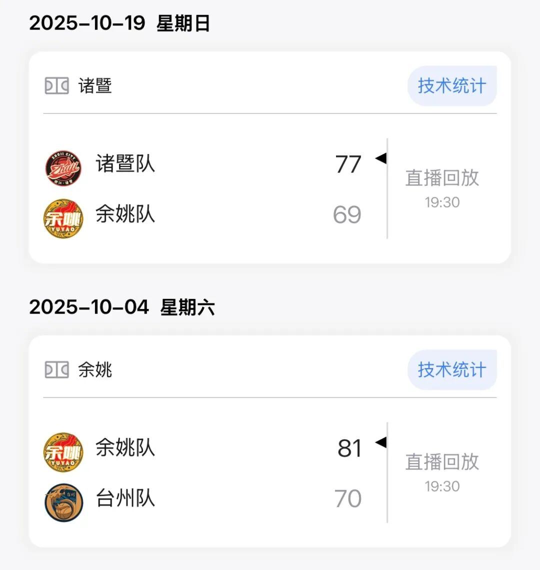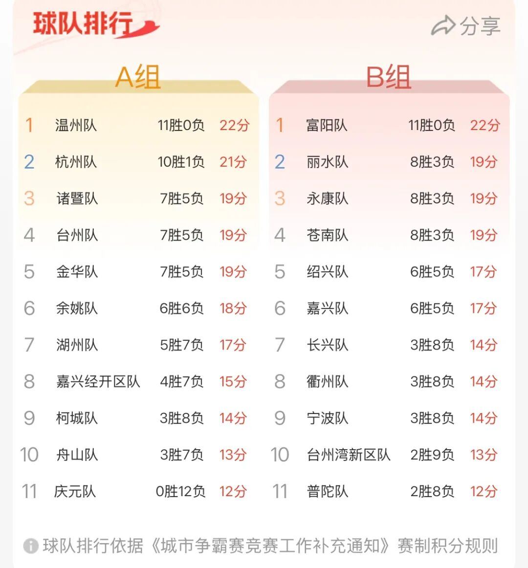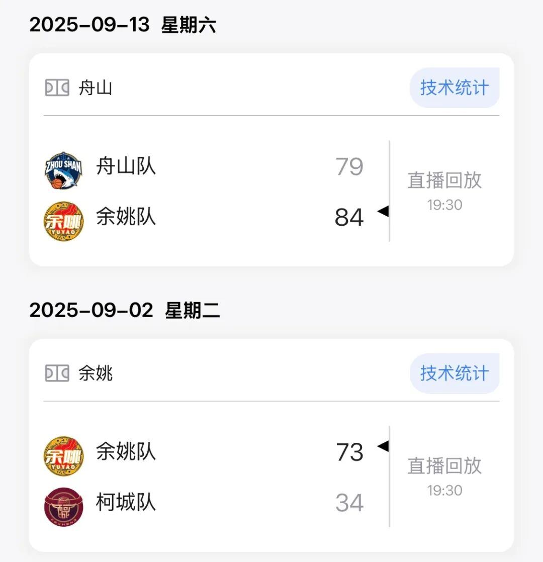本场比赛后,余姚队在城市争霸赛的战绩为6胜6负积18分。此前战绩如下: