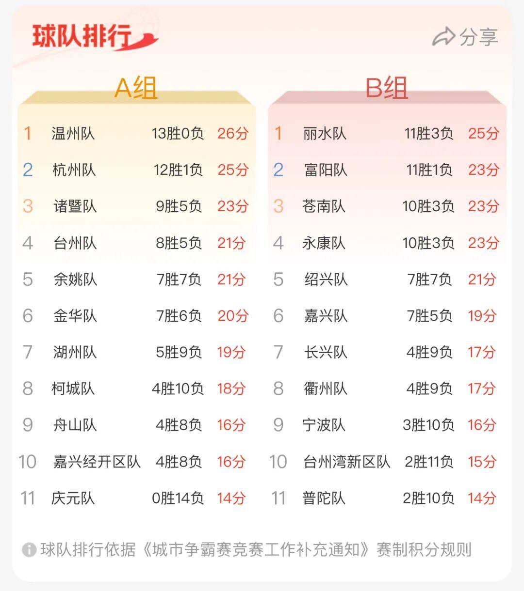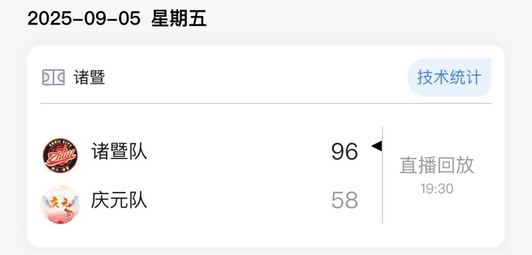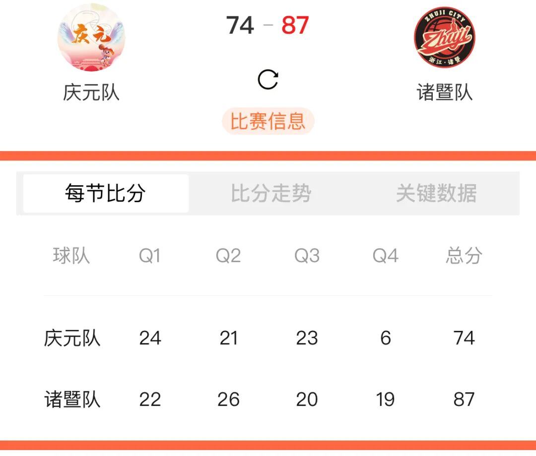 本场比赛后,庆元队的战绩为0胜14负积14分,诸暨队的战绩为9胜5负积23分。