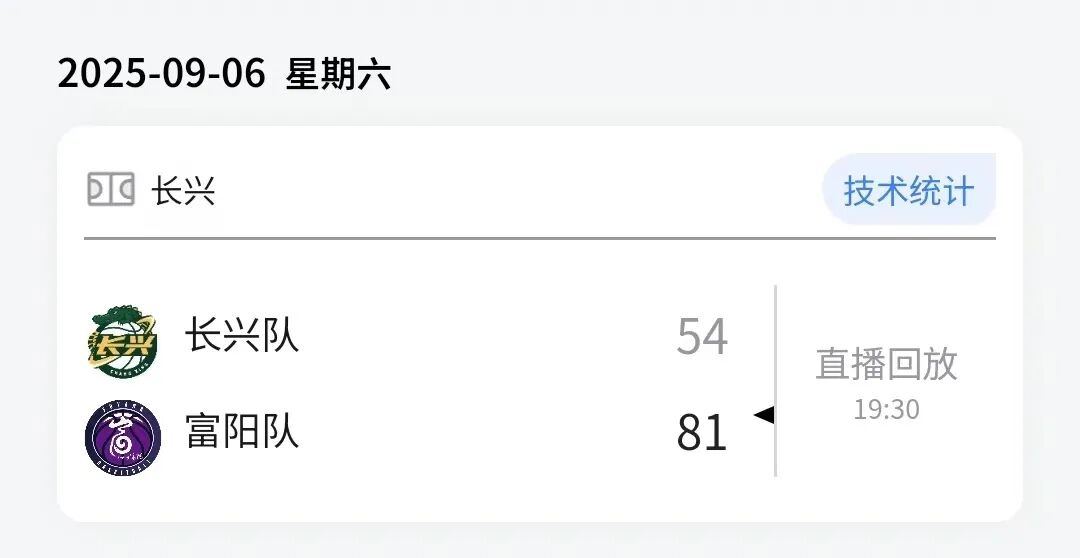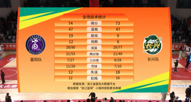 本场比赛后,富阳队的战绩为12胜1负积25分,长兴队的战绩为4胜10负积18分。