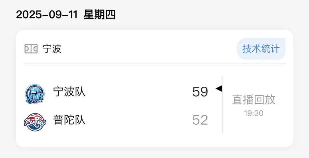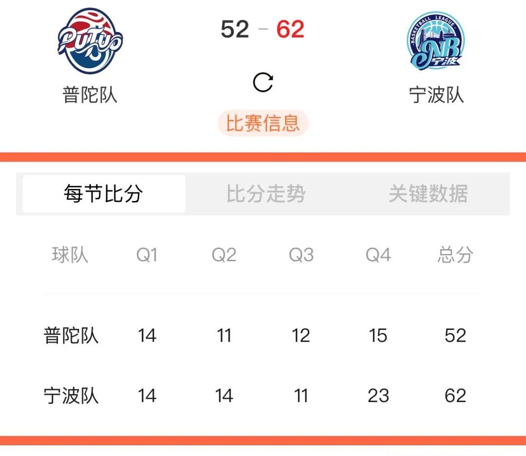 本场比赛后,普陀队的战绩为3胜11负积17分,宁波队的战绩为5胜10负积20分。