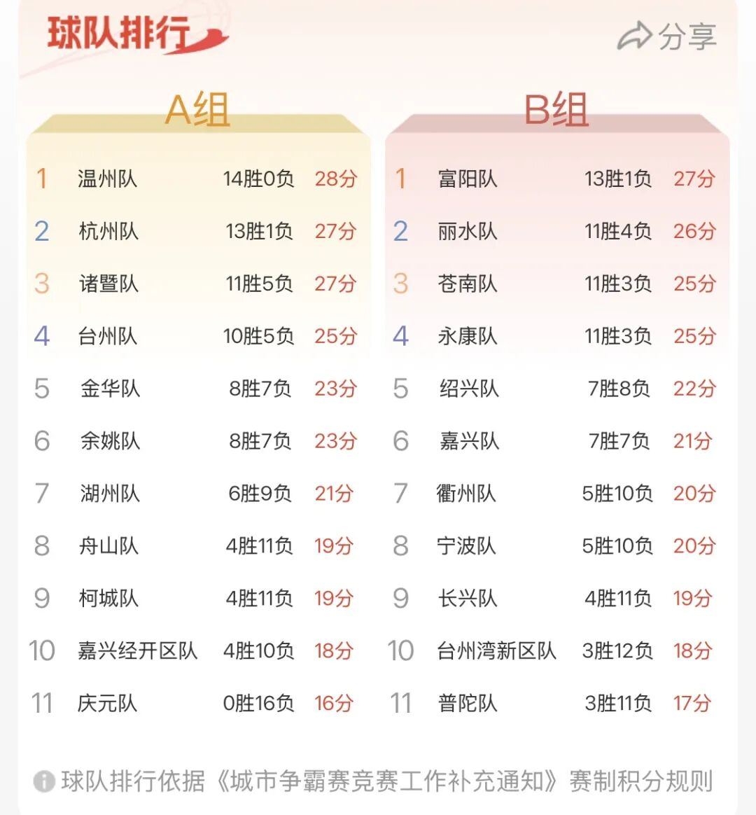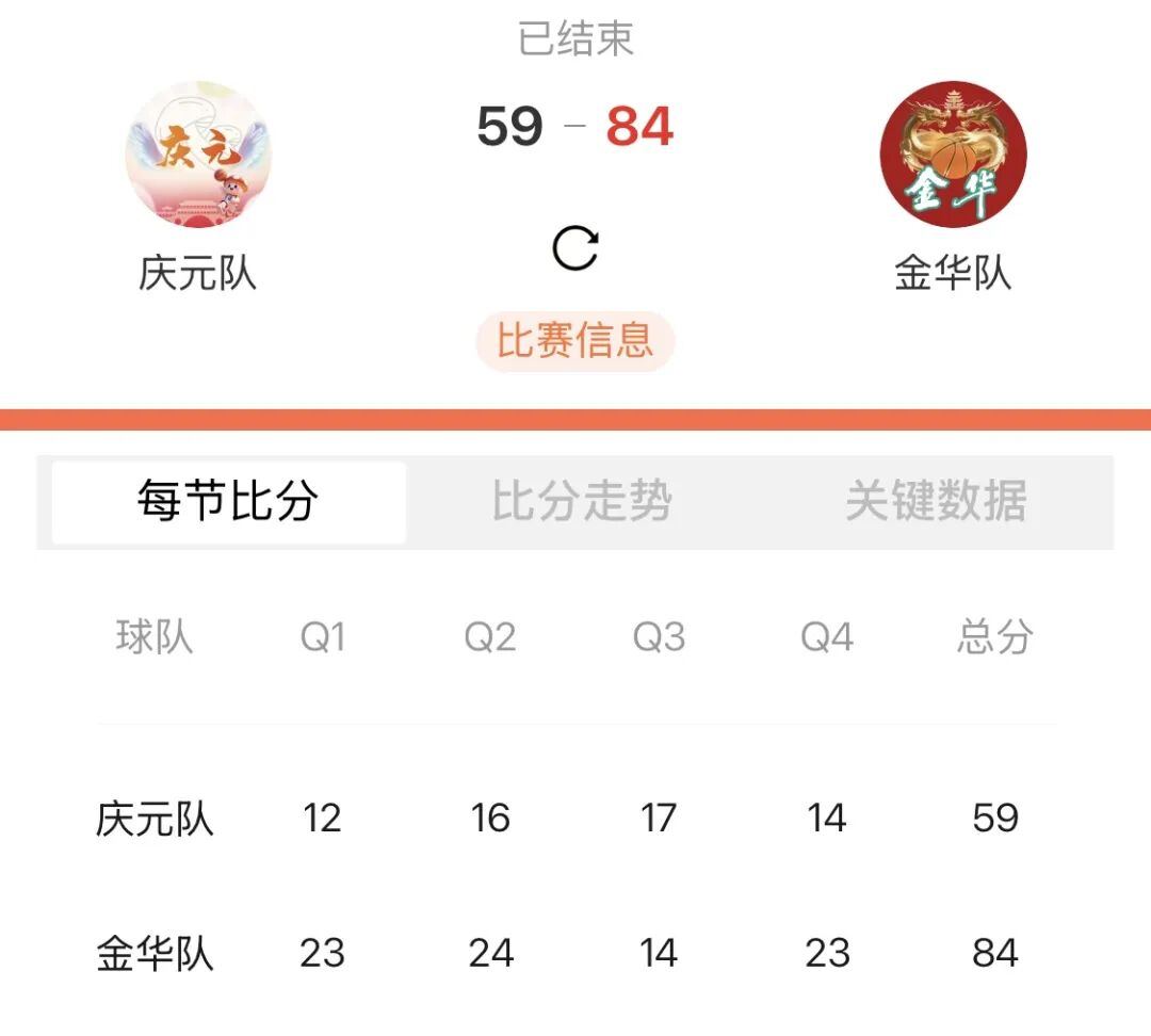 本场比赛后,庆元的战绩为0胜16负积16分,金华的战绩为8胜7负积23分。