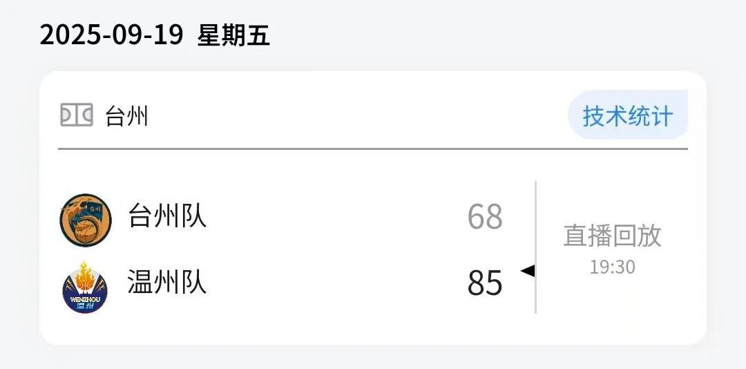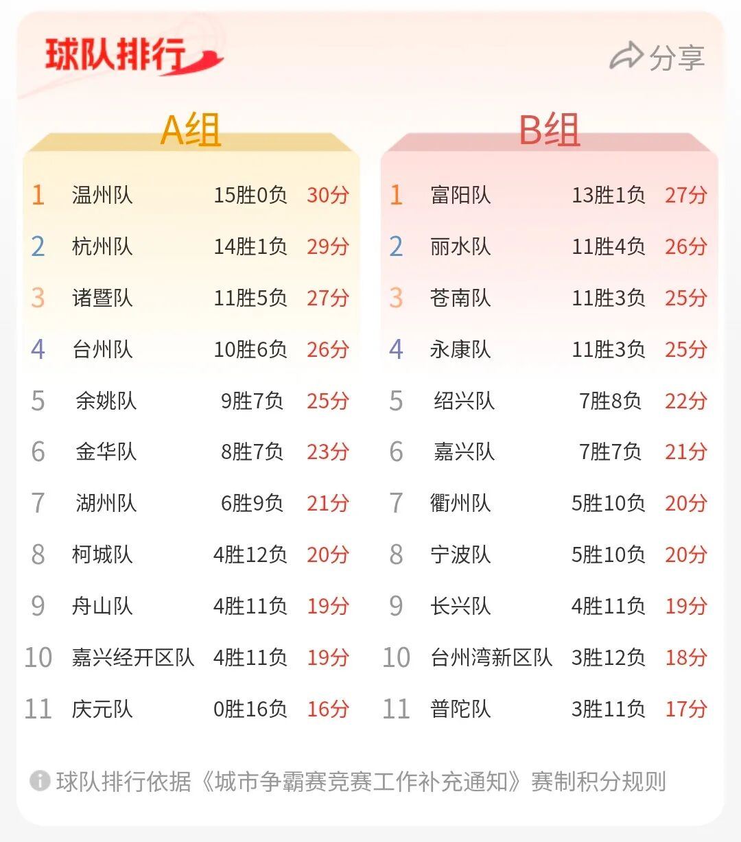 本场比赛后,温州队的战绩为15胜0负积30分,台州队的战绩为10胜6负积26分。