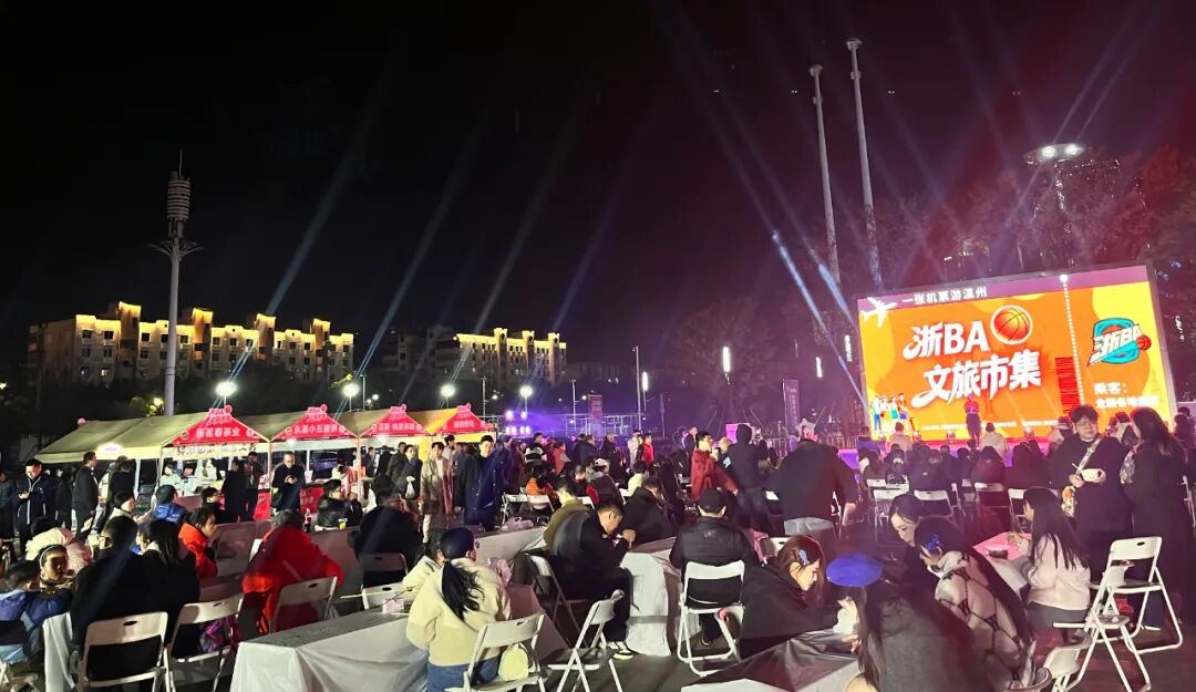本场见证温州队直通八强的比赛,现场热度再度达到高峰。比赛还没开场,体育馆外的第二观赛现场和文旅市集已经人声鼎沸。大屏舞台+热气腾腾的美食摊位吸引不少球迷驻足。