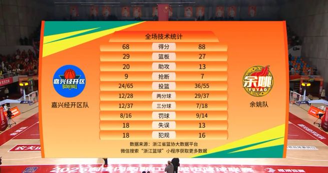 本场比赛后,嘉兴经开区队的战绩为4胜11负积19分,余姚队的战绩为9胜7负积25分。