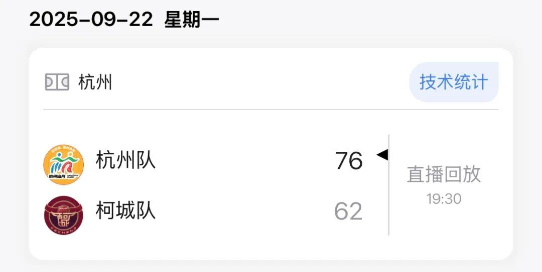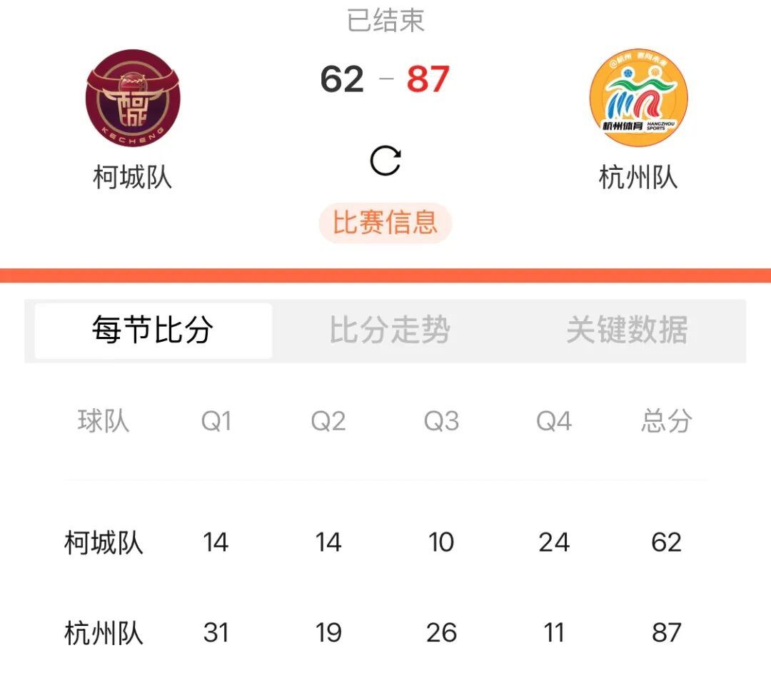本场比赛后,柯城的战绩为4胜12负积20分,杭州的战绩为14胜1负积29分。