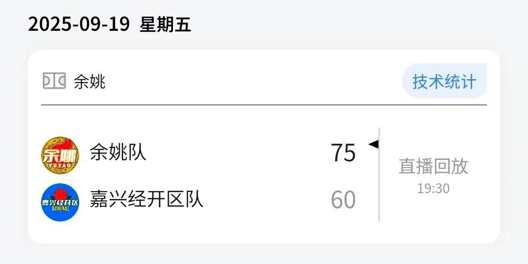 本场比赛后,嘉兴经开区队的战绩为4胜11负积19分,余姚队的战绩为9胜7负积25分。