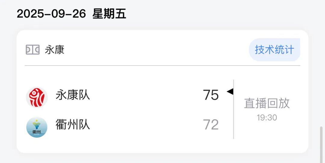 本场比赛后,衢州队的战绩为5胜12负积22分,永康队的战绩为12胜4负积28分。