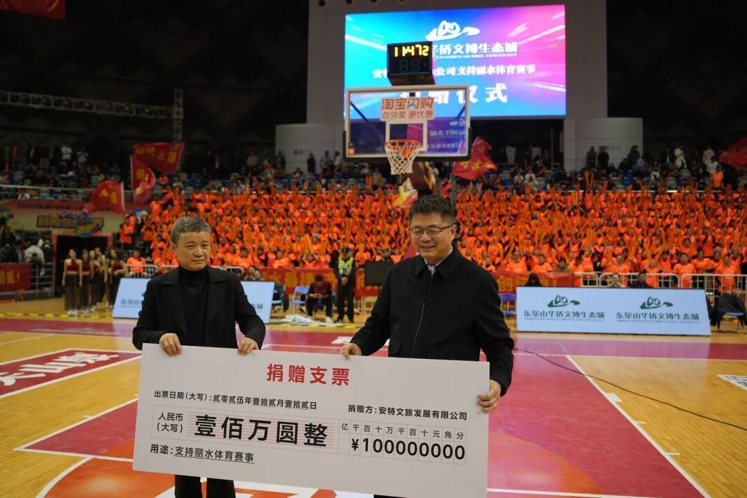 今晚中场还有特别环节——为了支持丽水体育赛事,浙江安特文旅发展有限公司捐赠100万元爱心款,现场举行了捐赠仪式。安特总部位于青田,是一家深耕文旅全链条运营的本土企业。