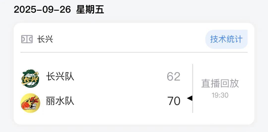 本场比赛后,丽水队的战绩为13胜4负积30分,长兴队的战绩为4胜12负积20分。