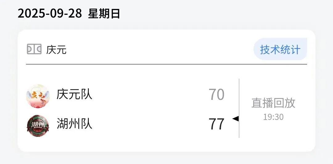 本场比赛后,湖州队的战绩为7胜9负积23分,庆元队的战绩为0胜17负积17分。