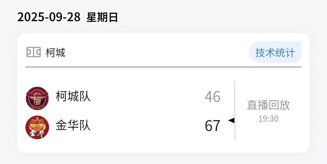 本场比赛后,金华队的战绩为9胜7负积25分,柯城队的战绩为4胜13负积21分。