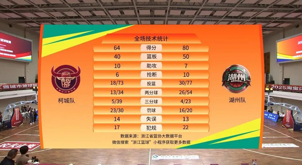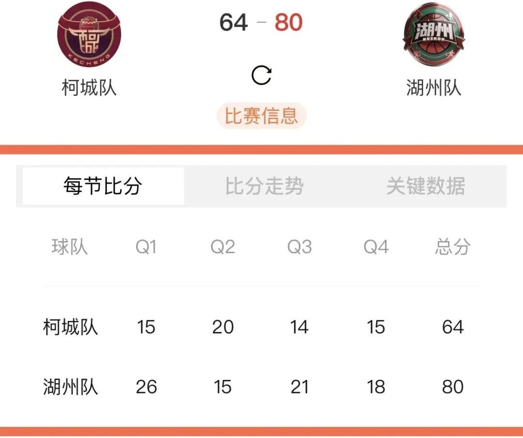 本场比赛后,柯城队的战绩为4胜14负积22分,湖州队的战绩为8胜9负积25分。