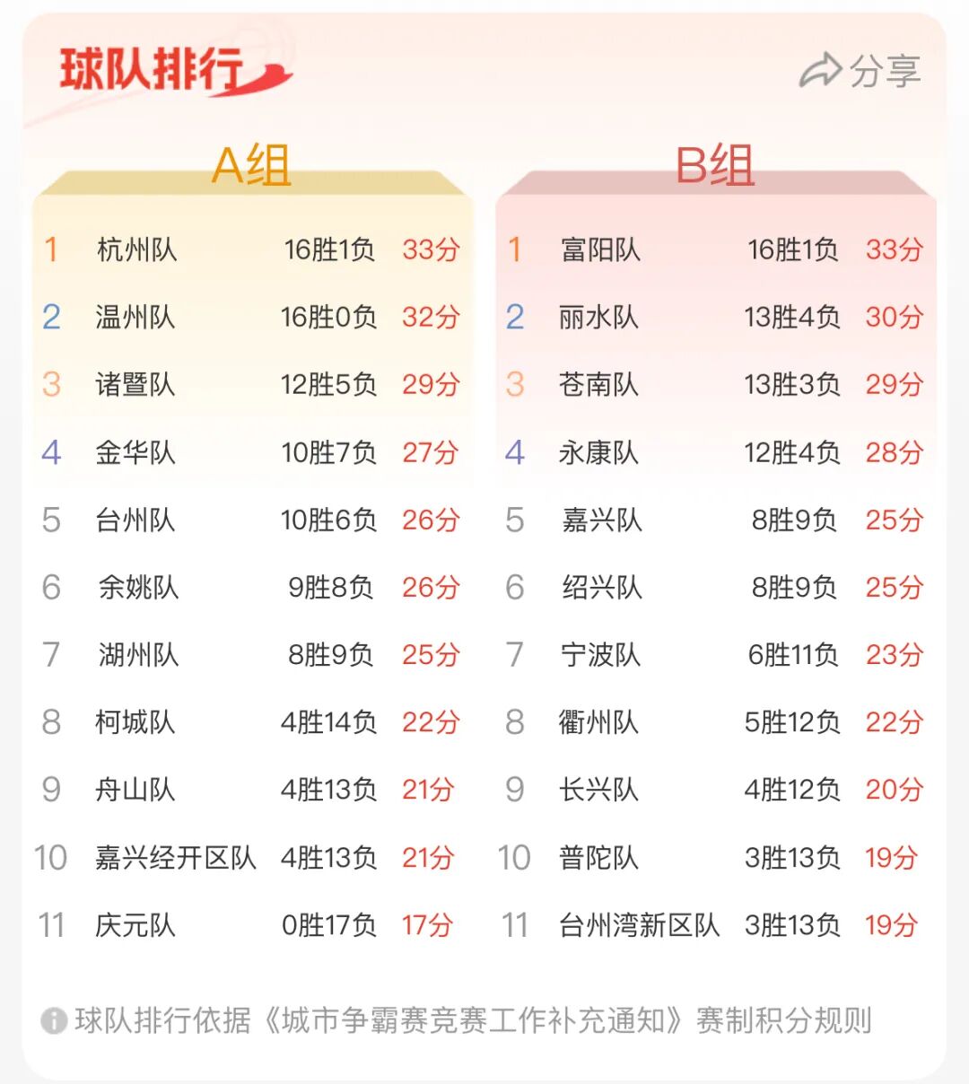 本场比赛后,富阳队的战绩为16胜1负积33分,嘉兴队的战绩为8胜9负积25分。