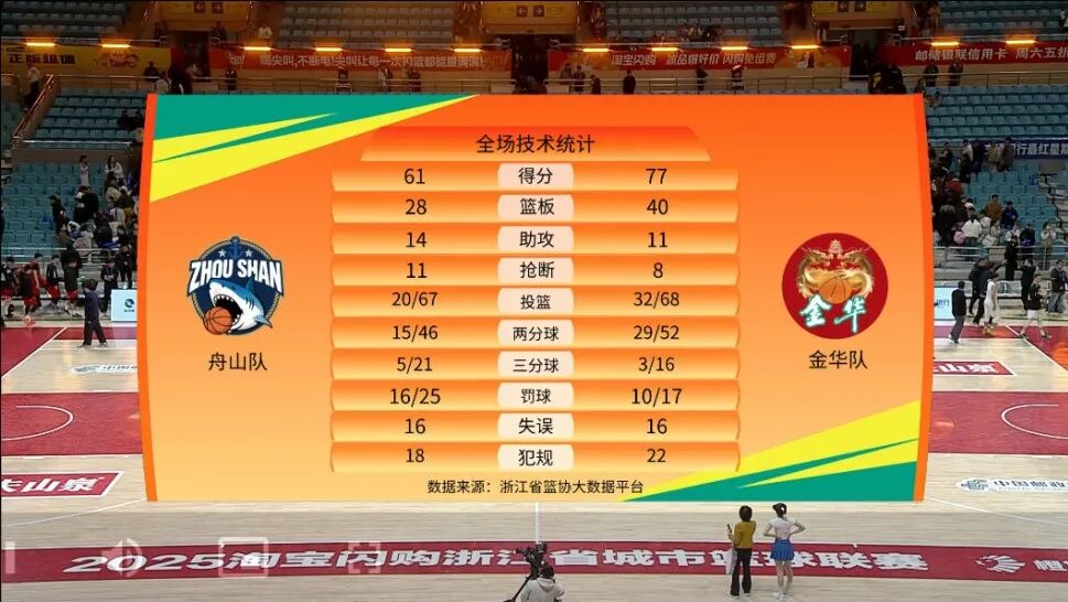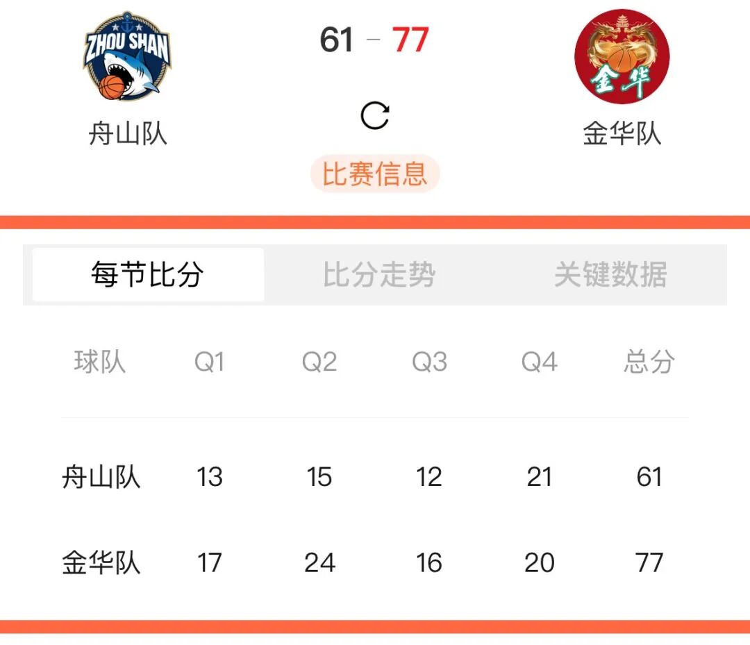 本场比赛后,舟山队的战绩为4胜13负积21分,金华队的战绩为10胜7负积27分。