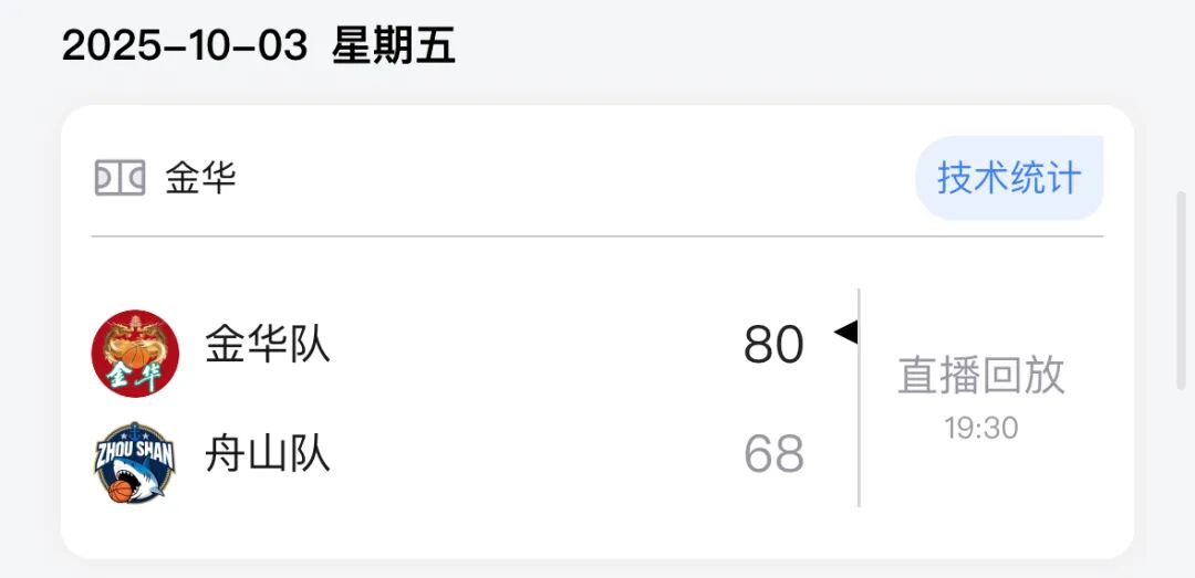 本场比赛后,舟山队的战绩为4胜13负积21分,金华队的战绩为10胜7负积27分。