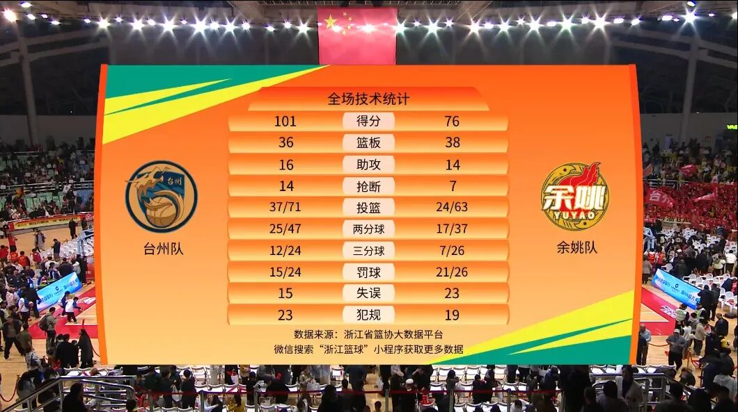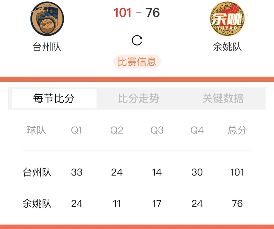 本场比赛后,台州队的战绩为11胜6负积28分,余姚队的战绩为9胜9负积27分。