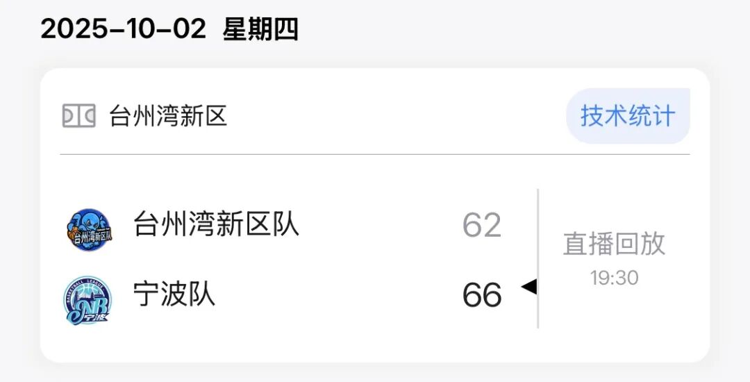 本场比赛后,宁波队的战绩为7胜11负积25分,台州湾新区队的战绩为3胜14负积20分。