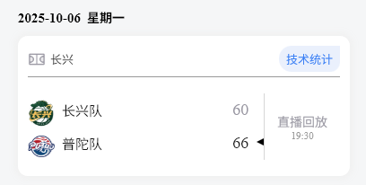 本场比赛后,普陀队的战绩为3胜15负积21分,长兴队的战绩为5胜13负积23分。