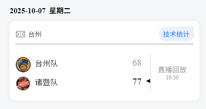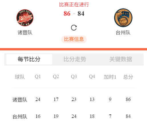 本场比赛后,诸暨队的战绩为13胜6负积32分,台州队的战绩为11胜7负积29分。