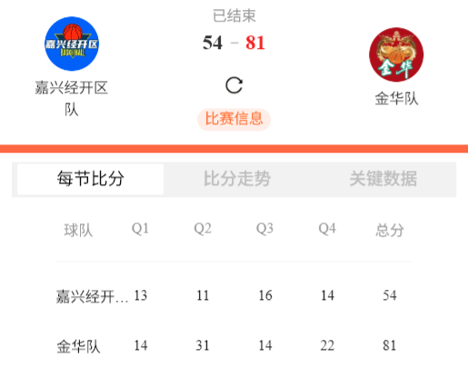 本场比赛后,嘉兴经开区队的战绩为4胜14负积22分,金华队的战绩为11胜7负积29分。