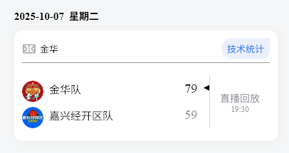 嘉兴经开区队下一场比赛将在1月2日19:30主场对阵湖州队,金华队下一场比赛将在12月30日19:30客场对阵温州队。
