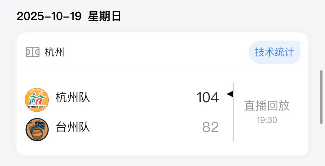 本场比赛后,台州队的战绩为12胜7负积31分,杭州队的战绩为17胜2负积36分。